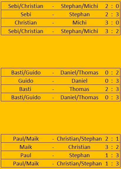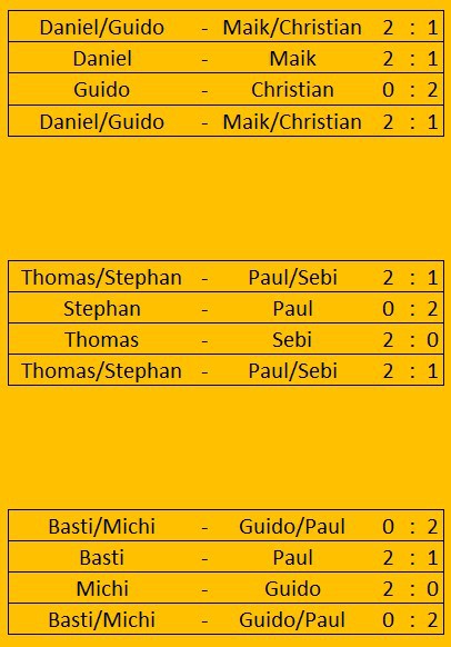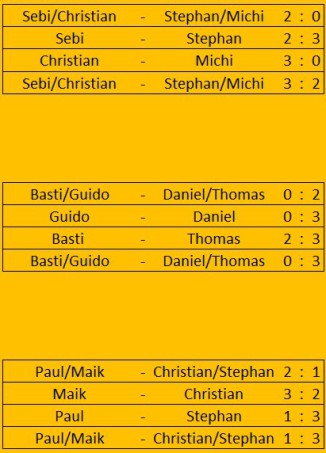 Das deutlich kanppste Spiel war ganz sicher das Duell von Maik/Paul gegen Christian/Stephan. Grob gesagt war da in jedem Spiel alles drin und folgerichtig gab es am Ende eine Punkteteilung, bzw.